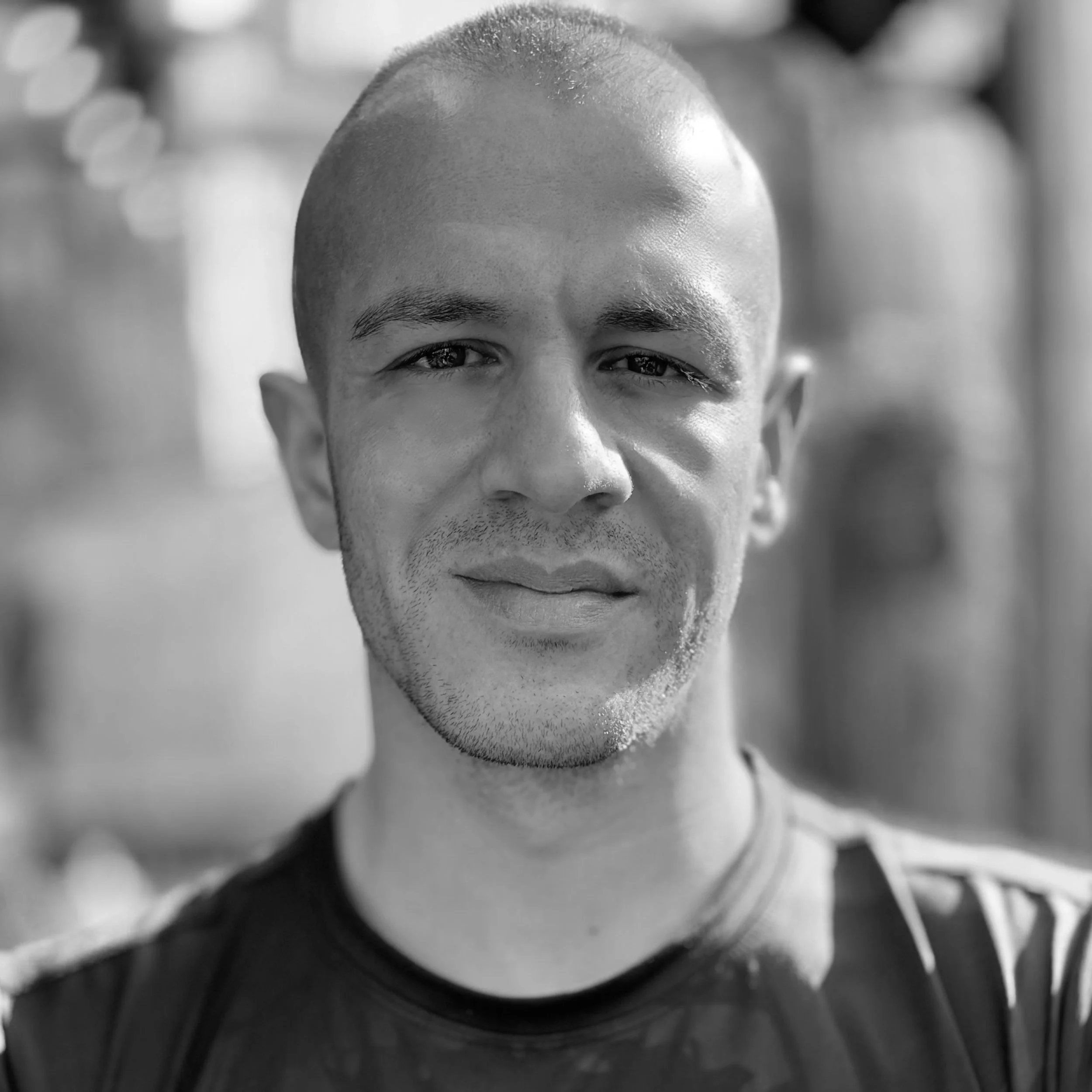 Zwart-wit foto van een man met een korte haardracht die naar de camera kijkt.